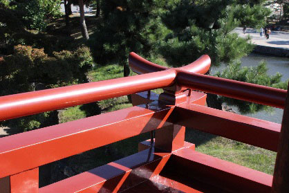 Vermilion-painted Hane Kouran (handrails) are installed around the three directions of the Moon Viewing Tower, which gives us an impression that it was built during a peaceful period. The ceiling is shaped like the bottom of a boat, somewhat reddish from persimmon tannin painted over it.