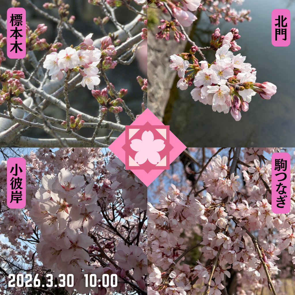 2026年3月30日(月) 本日、ソメイヨシノの開花宣言を行いました!駒つなぎの桜とコヒガンザクラは満開に近いです。/The Cherry Blossoms in the Honmaru Garden are almost in full bloom!